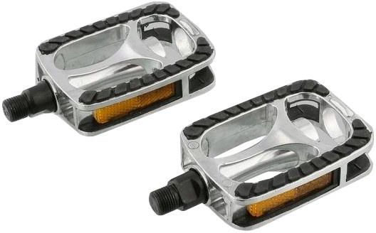 Simson zestaw pedałów Elegant Specyfikacje: Rodzaj roweru: rower miejski, rower elektryczny Kolor: srebrno-czarny Materiał: aluminium, guma Waga zestawu: 400 gramów Rozmiar osi: 9/16 cala Wymiary platformy: 7 x 9,5 cm (dł. x szer.) Typ produktu: 021978 Pedały rowerowe posiadają gumową warstwę antypoślizgową zapewniającą dodatkową przyczepność. Z odbiciem. Zawartość: 2 Pedały