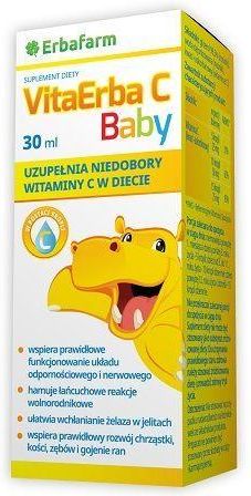 Erbafarm VitaErba C Baby krople 30 ml Erbafarm VitaErba C Baby - suplement diety zawierający witaminę C rozpuszczoną w wodzie dejonizowanej. Produkt przeznaczony dla dzieci powyżej 1 miesiąca życia. Składniki 99,5% (nośnik), Woda dejonizowana (nośnik), Kwas l-askorbinowy. Składnik 5 kropli % RWS 10 kropli % RWS 15 kropli % RWS Witamina C (Kwas l-askorbinowy) 25 mg 31% 50 mg 62% 75 mg 93% *% RWS - Referencyjna Wartość Spożycia. Masa netto 30 ml Właściwości składników Witamina C pomaga w prawidłowym funkcjonowaniu układu nerwowego i układu odpornościowego oraz w ochronie komórek przed stresem oksydacyjnym. Wspomaga produkcję kolagenu, elastyny i substancji międzykomórkowej oraz zwiększa przyswajanie żelaza. Przyczynia się do utrzymania prawidłowego metabolizmu energetycznego oraz do zmniejszenia uczucia zmęczenia i znużenia. Zalecane dzienne spożycie Niemowlęta powyżej 1. miesiąca i dzieci poniżej 3. roku życia: 5 kropli dziennie. Dzieci od 3. do 11. roku życia: 10 kropli dziennie. Dzieci powyżej 12 roku życia i dorośli: 15 kropli dziennie. Ostrzeżenia dotyczące bezpieczeństwa Nie stosować w przypadku nadwrażliwości na którykolwiek ze składników produktu. Preparat nie powinien być stosowany przez kobiety w ciąży i karmiące piersią. Nie należy przekraczać zalecanej dziennej porcji Suplement diety nie może być stosowany jako substytut (zamiennik) zróżnicowanej diety. Dla utrzymania prawidłowego stanu zdrowia należy stosować zróżnicowaną dietę i prowadzić zdrowy tryb życia Przechowywać w temperaturze pokojowej Przechowywać w sposób niedostępny dla małych dzieci