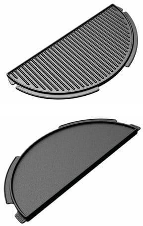 Żeliwna Płyta plancha półksiężyc Big Green Egg XLarge (Half Cast Iron Plancha XL 122995) Żeliwna Płyta Plancha Półksiężyc jest szczególnie przydatna do grillowania drobnych kawałków mięsa, warzyw czy ryb, które mogłyby przelecieć przez szczeliny w ruszcie grilla. Jest ona dwustronna, po jednej stronie jest ona gładka, a po drugiej żebrowana. Na gładkiej grillujemy warzywa, jajka, naleśniki, na karbowanej możemy grillować karkówki, steki itp. Zajmuje połowę rusztu i może być osadzana na stojakach dedykowanych do grilla Big Green Egg XL