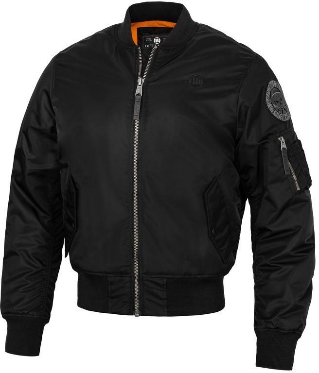 Przejściowa kurtka męska z kolekcji jesień / zima firmy PIT BULL WEST COAST – MA-1 Verano - fason oversize do pasa typu bomber - wykonana z wysokiej jakości grubej tkaniny nylonowej - pikowana podszewka w kontrastowym pomarańczowym kolorze pod którą znajduje się warstwa ocieplająca - żebrowane ściągacze na rękawach oraz u dołu kurtki - niski żebrowany kołnierz - dwie boczne kieszenie z klapami zapinanymi na zatrzaski - dodatkowa zapinana kieszeń na lewym rękawie - praktyczna kieszeń wewnątrz kurtki - metalowe zamki oraz duże skórzane zawieszki na suwakach ułatwiające rozpinanie - małe wyszywane logo Pi Bull na klatce piersiowej - wyszywana okrągła naszywka na lewym rękawie - skład materiału: na zewnątrz – 100% nylon / podszewka – 100% nylon / wypełnienie – 100% poliester - kolor: czarny