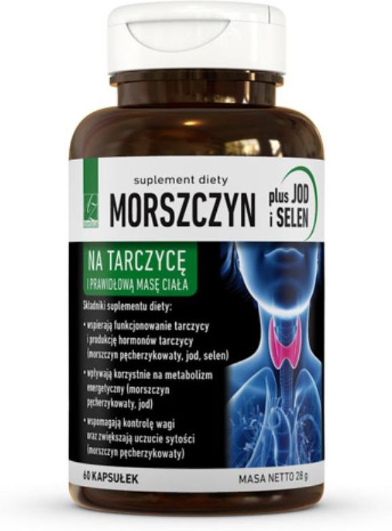 MORSZCZYN PLUS JOD I SELEN: 60 kapsułek MORSZCZYN PLUS JOD I SELEN 60 kapsułek Opis Suplement diety przeznaczony dla osób pragnących wspomóc pracę tarczycy oraz zachować prawidłową masę ciała. Składnikiem aktywnym produktu jest ekstrakt z plechy morszczynu pęcherzykowatego (Fucus vesiculosus), zawierający jod (100% RWS w zalecanej porcji dziennej) i selen (181,8% RWS w zalecanej porcji dziennej). Działanie i zastosowanie Morszczyn pęcherzykowaty jest algą morską cenioną z uwagi na zawartość jodu. Wspiera czynności tarczycy i produkcję jej hormonów, wpływa korzystnie na metabolizm energetyczny, ułatwia kontrolę wagi, zwiększając uczucie sytości, a także wspiera zdrowie jelit i wspomaga trawienie. Zawarty w produkcie jod wspomaga prawidłowe funkcjonowanie tarczycy oraz przyczynia się do utrzymania prawidłowego metabolizmu energetycznego, a ponadto m.in. bierze udział w prawidłowym przebiegu procesów poznawczych i funkcji neurologicznych. Skład maltodekstryna, ekstrakt z plechy morszczynu pęcherzykowatego (Fucus vesiculosus), kapsułka (żelatyna, woda), drożdże wzbogacone w selen, substancja przeciwzbrylająca – sole magnezowe kwasów tłuszczowych. Stosowanie 1 kapsułka dziennie, popijając płynem. Przeciwwskazania Nie zaleca się kobietom w ciąży i w okresie karmienia. Ostrzeżenia Nie należy przekraczać zalecanej porcji do spożycia w ciągu dnia. Suplement diety nie może być stosowany jako substytut (zamiennik) zróżnicowanej diety. Ważne jest stosowanie zbilansowanej i zróżnicowanej diety oraz prowadzenie zdrowego trybu życia. Suplement diety nie zastępuje zrównoważonego sposobu żywienia i zdrowego trybu życia. Zawartość opakowania 1 opakowanie zawiera 60 kapsułek. Przechowywanie Przechowywać w miejscu niedostępnym dla dzieci, w temperaturze pokojowej, chroniąc od światła i wilgoci.