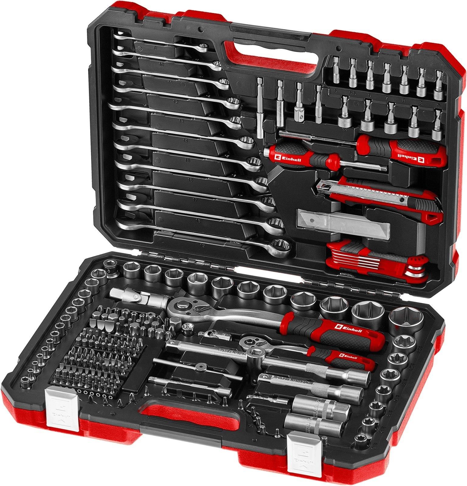 Zestaw narzędzi EINHELL 49370640 (233 elementy) to kompletny i wszechstronny zestaw do prac warsztatowych, domowych oraz przy pojazdach, zamknięty w solidnej walizce z dwoma poziomami i metalowymi zamkami.