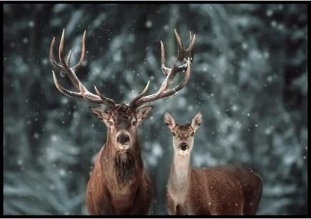 Zdjęcie pary jeleni na tle lasu obsypanego śniegiem. Do plakatu nie jest dołączona ramka. *PLAKAT NIESPODZIANKA - to dowolny plakat z naszej kolekcji, w dowolnym wymiarze, jednak nie większy niż zamówiony rozmiar. Plakat konfekcjonowany jest losowo, dlatego nazywa się niespodzianka. My również nie wiemy, jaki wzór do Ciebie trafi. Jednak każdy lubi niespodzianki, dlatego możemy śmiało stwierdzić, że to oczekiwanie sprawi niesamowitą radość.