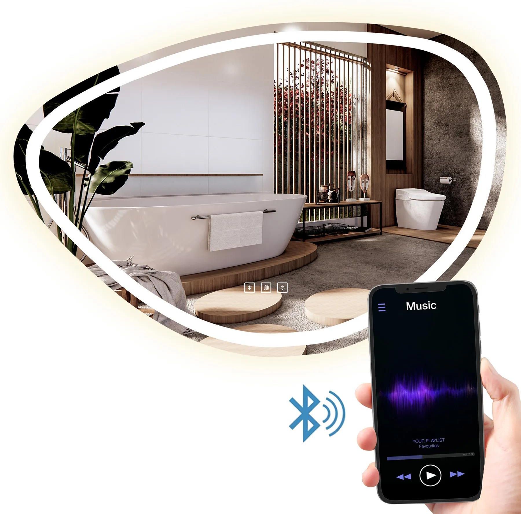 Asymetryczne lustro z podświetleniem Led to idealna propozycja dla tych którzy cenią sobie wygodę użytkowania oraz nowoczesny design. Lustro jest wykonane z najwyższej jakości materiałów, idealnie się prezentuje oraz jest bardzo wytrzymałe. Posiada do wyboru trzy zmieniane dotykowo barwy światła Led – ciepła, neutralną i zimną oraz funkcję podgrzewania zapobiegającą zaparowaniu powierzchni. Przewód zasilający w kolorze białym o długości 110cm. Dodatkowo lustro posiada funkcję Bluetooth oraz wbudowane głośniki. Wystarczy połączyć się z lustrem za pomocą smartfonu lub tabletu i cieszyć się swoimi ulubionymi utworami lub podcastami. Ramka Led: ok. 2,5 cm Odległość ramki Led od krawędzi: ok. 2 cm