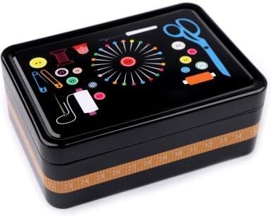 Zestaw do szycia w stylowym blaszanym pudełku z krawieckim motywem znajdzie zastosowanie w każdym domu. Zawartość zestawu: - 6 szt nici poliestrowych - małe nożyczki - 10 szt. agrafek - komplet szpilek z plastikową główką - komplet igieł - prujka - dwustronny metr (150 cm/60″) - plastikowy naparstek Wymiary: 10 x 14,5 cm Wysokość: 5,6 cm