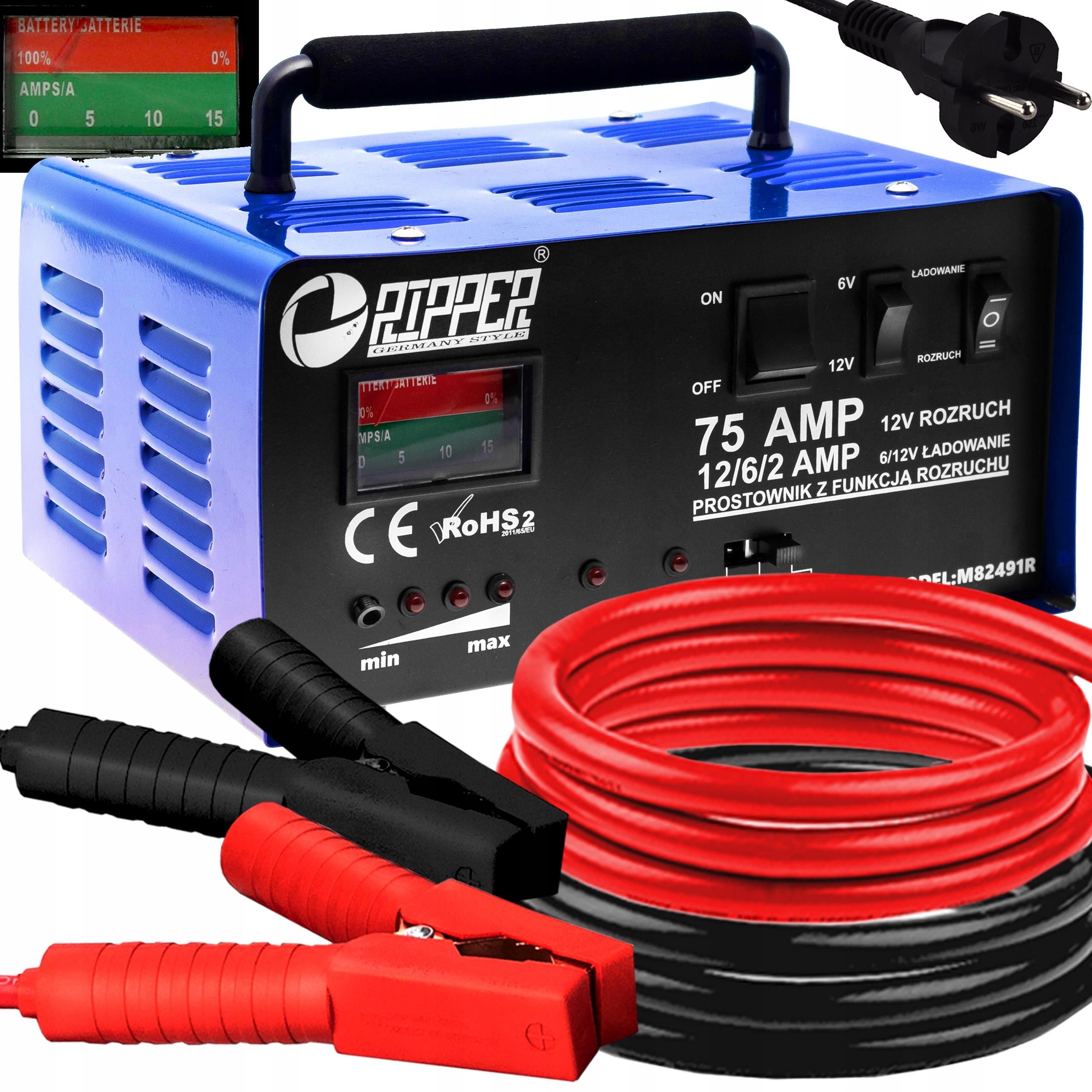 PROSTOWNIK Z ROZRUCHEM ŁADOWARKA SAMOCHODOWA 6/12V Kod: M82492R Producent: RIPPER Dostępność: Produkt dostępny CHARAKTERYSTYKA: PROSTOWNIK Z ROZRUCHEM ŁADOWARKA SAMOCHODOWA 6/12V Prostownik z rozruchem to urządzenie niezbędne w każdym garażu, warsztacie, a także w serwisach samochodowych oraz gospodarstwach rolnych. Urządzenie jest dostosowane do ładowania prądem o napięciu zarówno 6V jak i 12V. Prostownik cechuje się niewielkimi wymiarami i solidną metalową obudową odporną na uszkodzenia mechaniczne oraz zużycie. Posiada on wbudowany amperomierz, który umożliwia kontrolę ładowania oraz dokładny odczyt chwilowego natężenia prądu. Amperomierz pozwala również na określenie poziomu naładowania akumulatora. Końcówki przewodów wyposażone są w mocne zaciski, gwarantujące dokładność ładowania. Urządzenie dzięki swoim niewielkim wymiarom oraz doskonałym parametrom jest niezwykle uniwersalne i poręczne, a do tego łatwe w przechowywaniu. Prostownik ten może ładować wszystkie akumulatory kwasowo-ołowiowe 12V. Może ładować zarówno akumulatory wyjęte z samochodu. jak i niewymontowane DANE TECHNICZNE: Napięcie zasilające: 230 V Napięcie wyjściowe: 6 V / 12 V Prąd ładowania max: 15 A Prąd rozruchu: 100 A Obsługiwane akumulatory: 60 - 200 ah Częstotliwość: 50/60Hz Prąd ładowania: 2,5- 15A Pobór prądu: 400W Waga netto: 5,5 KG ZAWARTOŚĆ ZESTAWU: Klemy przyłączeniowe Wskaźnik diodowy Wskaźnik analogowy Przełącznik rozruch/ładowanie Przełącznik wyboru napięcia Włącznik zasilania