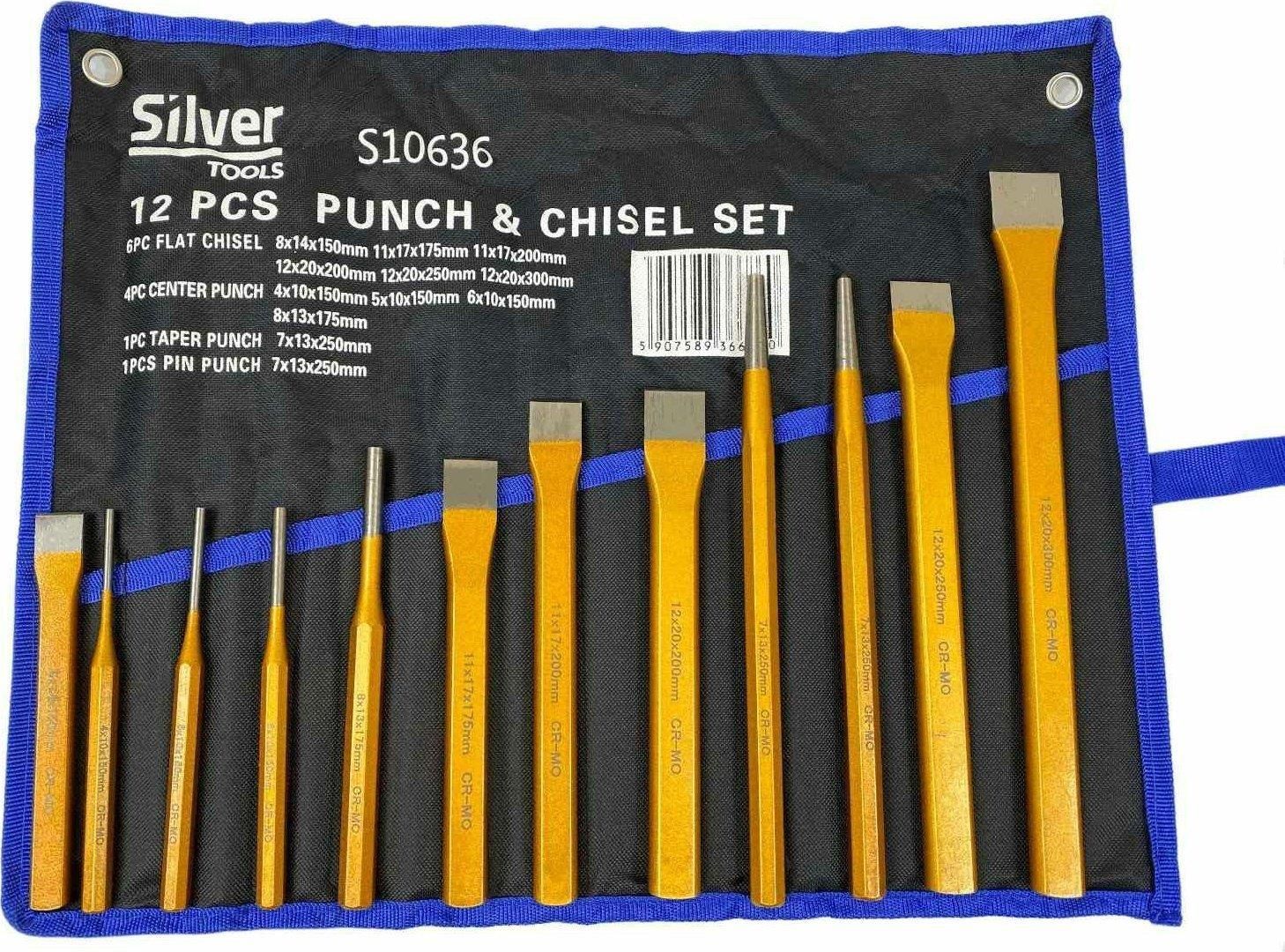 WYBIJAKI PRZECINAKI PUNKTAKI ZESTAW 12 EL. Cechy produktu: Zestaw został wykonany z wysokiej jakości materiałów w tym ze stali Cro-Mo, dodatkowo hartowany. Bardzo praktyczny i trwały znajdzie zastosowanie w profesjonalnych i amatorskich warsztatach. Długość całkowita od 150 mm do 300 mm. Zwiększona wytrzymałość krawędzi tnących. Część chwytowa narzędzi pokryta lakierem z oznaczeniem rozmiaru. Skład zestawu: - przecinaki 6 szt: 8x14x250 mm 11x17x175 mm 11x17x200 mm 12x20x200 mm 12x20x250 mm 12x20x300 mm - punktaki 4 szt: 4x10x150 mm 5x10x150 mm 6x10x150 mm 8x13x150 mm - wybijak stożkowy: 7x13x250 mm - wybijak walcowy: 7x13x250 mm - praktyczne etui