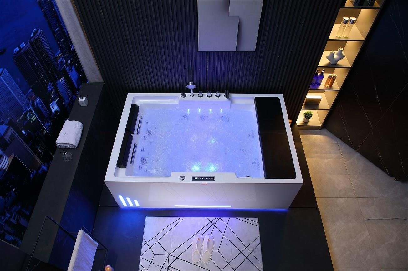 Wanna z hydromasażem wodnym LED i powietrznym LED- water effect 24 dysze do masaży.  Model: EB-D628 L Producent: Zepehof Seria: Moderno Quarrum Wymiary: 1840mm * 1200mm * 580mm Akcesoria: nogi regulowane usytuowane na stelażu kompletna futurystyczna bateria z przełącznikami funkcyjnymi korek …
