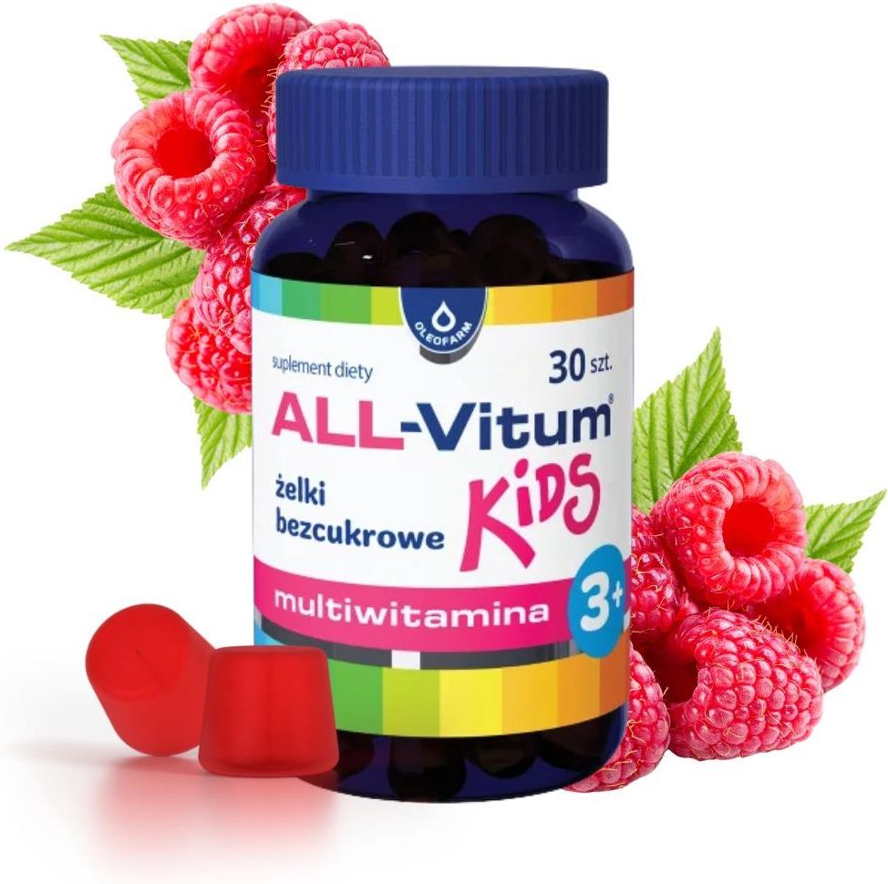 Suplement diety dla dzieci w formie żelków bez dodatku cukru Od 3go roku życia Wystarczy na miesiąc suplementacji All-Vitum KIDS Suplement diety | Zawartość: 30 żelków Codzienna troska o zdrowie dziecka to coś więcej niż pilnowanie posiłków i snu. Każdy rodzic chce, aby jego pociecha miała silną odporność, prawidłowy rozwój fizyczny i umysłowy oraz wystarczająco dużo energii, by aktywnie bawić się i uczyć. All Vitum KIDS to suplement diety dla dzieci w formie smacznych żelków, bez dodatku cukru, który w prosty sposób pozwala uzupełnić codzienną dietę dziecka w witaminy i minerały. Każdy żelek został stworzony tak, aby wspierać prawidłowe funkcjonowanie organizmu, wzmacniać naturalną odporność, także w okresie jesienno-zimowym i dostarczać składników odżywczych niezbędnych w procesie wzrostu i rozwoju. Produkt został stworzony z myślą o pociechach od 3. roku życia, a jednocześnie może być stosowany u starszych dzieci i dorosłych, którzy szukają smacznej, łatwej i wygodnej formy suplementacji witamin i minerałów. Każdy żelek All Vitum KIDS to starannie skomponowany zestaw witamin i minerałów, które wspierają prawidłowe funkcjonowanie i rozwój dziecka. W jego składzie znajdują się m.in. witaminy z grupy B: tiamina (B1), ryboflawina (B2), niacyna (B3), B6 i B12, które pomagają organizmowi efektywnie wytwarzać energię potrzebną do nauki i zabawy. Witaminy C i E działają jako naturalne antyoksydanty, wspierając odporność i chroniąc komórki przed stresem oksydacyjnym. Kwas foliowy, witamina A i D odgrywają ważną rolę w prawidłowym rozwoju organizmu, natomiast cynk, selen i jod uzupełniają dietę w niezbędne minerały, dbając o zdrowie i prawidłowe funkcje organizmu. Skład żelków został opracowany z myślą o codziennym, prostym i wygodnym stosowaniu, szczególnie u małych niejadków, które nie zawsze zjadają wszystko z talerza i przez to ich dieta nie dostarcza wszystkich potrzebnych składników. Zdrowe i Bezcukrowe żelki ALL Vitum KIDS. W odróżnieniu od wielu popularnych suplementów dla dzieci, All Vitum KIDS są całkowicie bezcukrowe. Dzięki temu żelki są zdrowsze dla zębów i nie dostarczają dodatkowego cukru, który w nadmiarze może wpływać na dietę malucha. Dzieci mogą cieszyć się przyjemnym, malinowym smakiem, a rodzice mają pewność, że suplementacja pozostaje w pełni bezpieczna i zdrowa. Dzienna porcja (1 żelek): Witamina C 40 mg (50%*) Witamina E 6 mg (50%*) Tiamina 0,55 mg (50%*) Ryboflawina 0,6 mg (43%*) Niacyna 8 mg (50%*) Witamina B6 0,6 mg (43%*) Witamina B12 1,2 µg (48%*) Kwas foliowy 100 µg (50%*) Witamina A 400 µg (50%*) Witamina D 2,5 µg (50%*) Cynk 5 mg (50%*) Selen 27,5 µg (50%*) Jod 50 µg (33%*) *% referencyjnej wartości spożycia Składniki: Substancja słodząca: maltitole, żelatyna, woda, kwas L-askorbinowy, regulator kwasowości: kwas cytrynowy, octan DL-alfa-tokoferylu, amid kwasu nikotynowego, aromat, glukonian cynku, koncentrat czarnej marchwi, substancja glazurująca: wosk carnauba, ryboflawina, monoazotan tiaminy, chlorowodorek pirydoksyny, octan retinylu, kwas pteroilomonoglutaminowy, jodek potasu, selenian (VI) sodu, cholekalcyferol, cyjanokobalamina. Przechowywanie: Przechowywać w temperaturze pokojowej, w suchym i ciemnym miejscu, w sposób niedostępny dla małych dzieci. Ważne informacje: Nie należy przekraczać zalecanej porcji do spożycia w ciągu dnia. Suplementy diety nie mogą być stosowane jako substytut (zamiennik) zróżnicowanej diety. Utrzymanie prawidłowego stanu zdrowia wymaga zrównoważonego odżywiania i prowadzenia zdrowego trybu życia. Spożycie w nadmiernych ilościach może mieć efekt przeczyszczający. Suplement diety ALL-Vitum KIDS zawiera substancje słodząca.