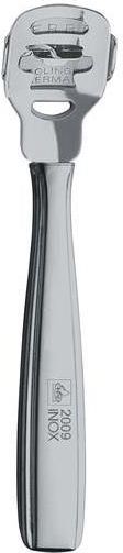 Profesjonalny nożyk do ścinania zrogowaciałowego naskórka stóp, głównie z pięt. Górna część ścinaka wykonana jest z chromowanej stali, a uchwyt wykonany z matowej stali nierdzewnej. Dzięki specjalnie ukształtowanej powierzchni uchwytu narzędzie wygodnie leży w dłoni. Wysokiej jakości ostrze ze stali nierdzewnej zapewnia bezbolesne i higieniczne usuwanie przesuszonej skóry. Wymienne ostrza można zakupić w naszym sklepie. Narzędzie ma długość 15 cm. Jakość ze znakiem Made in Solingen.