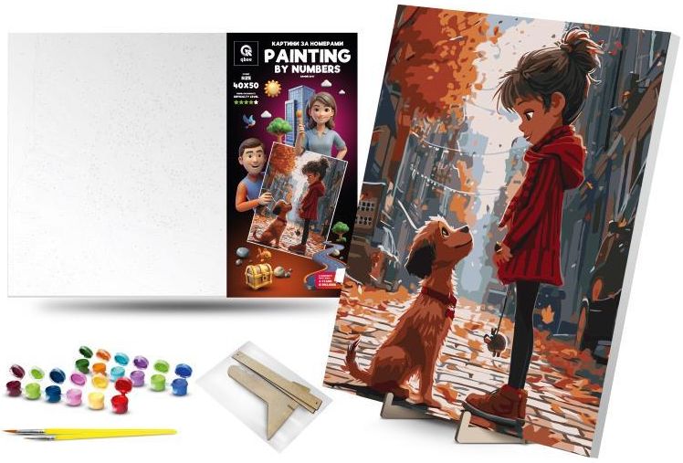 Malowanie po numerach Wierny przyjaciel 40x50 cm Qbee ✅ ✔️ Zestaw do malowania po numerach składa się z zagruntowanego płótna artystycznego na blejtramie, zestawu wysokiej jakości farb akrylowych odpornych na ścieranie i przypalanie o pojemności 2,5 ml 9% każda, nylonowych pędzli różnej wielkości, …