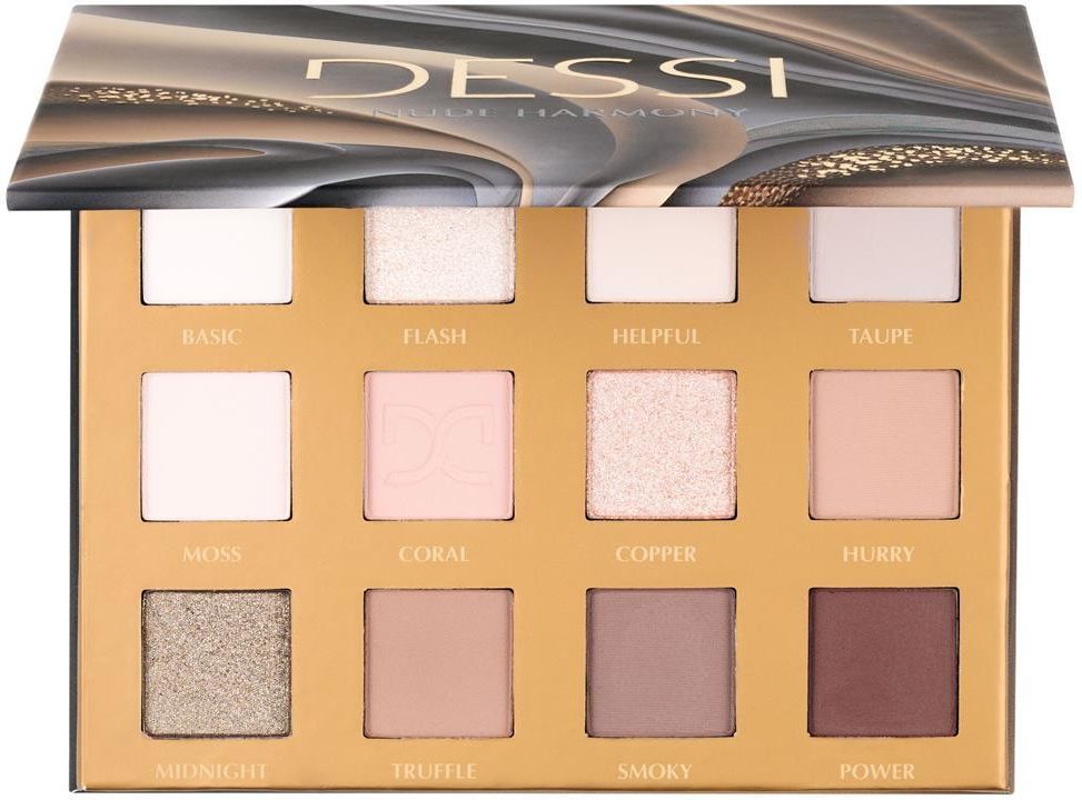 DESSI - Nude Harmony - Eyeshadow Palette - Paleta 12 cieni do powiek - Limitowana kolekcja Nude Harmony - Eyeshadow Palette marki DESSI. Paleta cieni do powiek. Zawiera w sobie cienie do powiek o różnych wykończeniach (matowym i perłowym). Pochodzi z limitowanej kolekcji Nude Harmony, skupiającej się wokół różnych wariantów odcienia nude w swoich produktach. Umożliwia stworzenie wielu niesamowitych i kuszących makijaży na co dzień, jak i tych na specjale okazje. Produkty są bardzo dobrze napigmentowane, zaś ich formuła i efekt na powiekach jest niezwykle długotrwały. Dodatkowo cienie łatwo się blendują. Dessi paleta umieszczona została w magnetycznej paletce z lusterkiem pod pokrywką zamykającą. Paleta 12 cieni do powiek. Posiada matowe i perłowe wykończenie. Umożliwia stworzenie wielu niesamowitych makijaży. Posiada lusterko pod magnetyczną pokrywą zamykającą. POSZCZEGÓLNE ODCIENIE:- BASIC - śmietankowo-beżowy (matowy),- FLASH - złoty (perłowy),- HELPFUL - waniliowy (matowy),- TAUPE - beżowo-szary (matowy),- MOSS - waniliowo-cielisty (matowy),- CORAL - beżowo-koralowy (matowy),- COPPER - miedziano-złoty (perłowy),- HURRY - beżowo-brązowy (matowy),- MIDNIGHT - oliwkowo-złoty (perłowy),- TRUFFLE - ciepły, jasny brąz (matowy),- SMOKY - chłodny, jasny brąz (matowy),- POWER - średni brąz (matowy). Atrybuty Waga netto - 20,8 g PAO termin trwałości - 18M