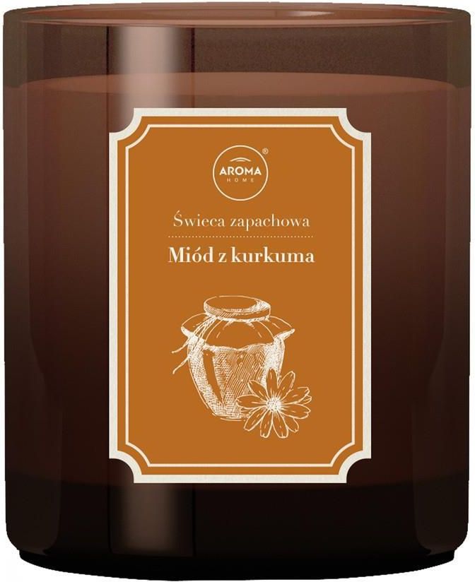Świeca Aroma Home Domowy Zielnik Miód i Kurkuma - słodkie ciepło i aromat natury w Twoim domuInspiracją dla projektów są skarby natury: żołędzie, liście, zioła, orzechy, szyszki czy owoce.Paleta kolorów podkreśla spokojny nastrój. Należą do nich: płowy brąz, czerwony buk, matowa zieleń, mech i ciepły, jasny odcień kamienia. Poszczególne odcienie są głębokie, bogate, niemal roślinne. Harmonijny obraz uzupełniają wzory i faktury nature elements.Rodzaj wosku: 100% wosk naturalnyPojemność: 160 gRodz