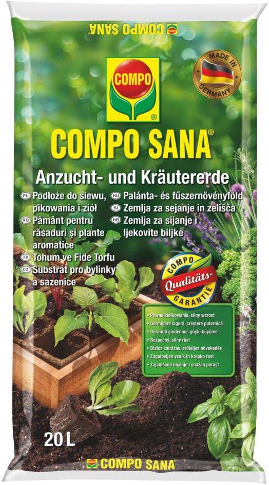 Podłoże do siewu, pikowania i ziół 20L COMPO SANA przyspiesza ukorzenianie PODŁOŻE DO SIEWU, PIKOWANIA I ZIÓŁ 20L COMPO Najwyższej jakości, naturalne podłoże specjalnie opracowane podłoże do wysiewu nasion, pikowania, przygotowywania rozsady i uprawy młodych roślin. Wyjątkowo delikatna struktura tworzy idealne warunki do rozwoju systemu korzeniowego młodych siewek. Zawiera wyłącznie naturalne składniki bez sztucznych dodatków, dzięki czemu doskonale sprawdza się w przypadku uprawy roślin jadalnych. Szczególnie wysoka zawartość humusu zapewnia żyzność podłoża i zdrowy wzrost roślin. Torf użyty do produkcji tego podłoża pochodzi z naturalnych złóż, które stale poddawane są rekultywacji. COMPO zwraca szczególną uwagę na ochronę i odtwarzanie naturalnych torfowisk. Dodatkowe komponenty organiczne zwiększają biologiczną aktywność pożytecznych mikroorganizmów, które pozytywnie wpływają na żyzność gleby i prawidłowy rozwój roślin: Zalety startowa dawka nawozu organicznego zapewnia odpowiednią ilość składników pokarmowych przez pierwsze 2-5 tygodni od posadzenia. Powolne i delikatne działanie nawozów organicznych gwarantuje stabilny wzrost posadzonych roślin bez ryzyka przenawożenia. kompost poprawia strukturę i właściwości podłoża, dodatkowo użyźnia, zwiększa jego biologiczną aktywność oraz zawartość materii organicznej. guano ptaków morskich zapewnia wysoką zawartość substancji biologicznie czynnych stanowiących bardzo cenne źródło składników pokarmowych dla roślin. naturalny piasek kwarcowy gwarantuje stabilność siewek oraz optymalne rozprowadzanie wody w podłożu. Podłoże powstało przy użyciu wyselekcjonowanych naturalnych surowców najwyższej jakości. Wszystkie wykorzystane komponenty spełniają restrykcyjne wymogi COMPO, a ścisła kontrola prowadzona przez niezależne instytuty badawcze w Niemczech gwarantują najwyższe parametry naszych produktów. Do produkcji tego podłoża wykorzystano wyłącznie surowce zgodne z Rozporządzeniem UE 834/2007, dzięki temu podłoże może być stosowane w uprawach ekologicznych. Najwyższej jakości specjalistyczne podłoże do siewu nasion, uprawy młodych siewek oraz przygotowywania rozsady Aktywator korzeni wzmacnia i przyspiesza rozwój systemu korzeniowego młodych roślin Delikatna i luźna struktura stwarza idealne warunki do wzrostu Dodatek środka powierzchniowo czynnego zapewnia optymalne rozprowadzenie wody i nawilżenie gleby Producent : Compo Pojemność/Opakowanie : 20L EAN : 4008398415419