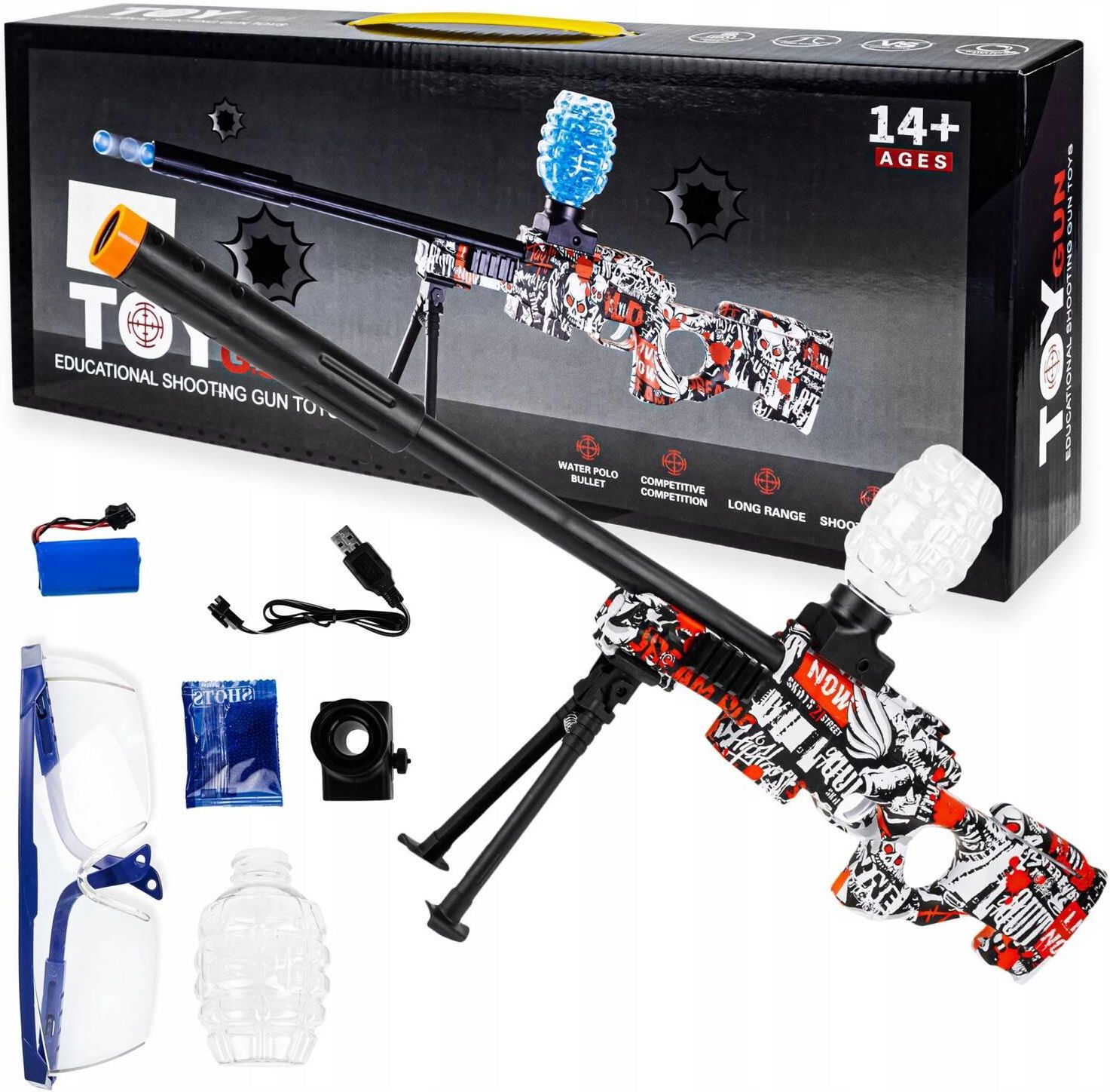 Karabin automatyczny na kulki żelowe 7/8 mm Wysokiej jakości pistolet elektryczny na akumulator + pełne wyposażenie to idealny prezent dla chłopca w każdym wieku! Zestaw zawiera wszystkie niezbędne elementy. Wystarczy wpiąć akumulator, użyć kulek i gotowe! W opakowaniu znajdziesz aż 1000 wodnych naboi. Są w pełni bezpieczne, rozbijają się o przeszkodzę dzięki czemu można używać ich także wewnątrz pomieszczenia. Najważniejsze cechy produktu: Wysoka jakość wykonania Lekka konstrukcja Bogate wyposażenie Automat – strzela seriami Amunicja – bezpieczne kulki żelowe 7/8 mm Zasięg ok. 20 metrów Duża ilość kulek pozwala na wiele godzin świetnej zabawy! Kulki należy rozrobić samodzielnie z pomocą wody. Naboje wsypujemy do naczynia i zalewamy wodą. Muszą być całkowicie zamoczone. Czas w jakim pęcznieją kulki to ok 3-4h. Średnica rozrobionej amunicja powinna wynosić 7/8mm. Zabawa w strzelca pomoże rozładować energię i wzmocni kondycję fizyczną Twojego dziecka. Wspomoże rozwój koordynacji wzrokowo ruchowej a także uczyskupienia uwagi i skoncentrowania. Specyfikacja: Wiek: 14+ Materiał: tworzywo ABS Automat - strzela seriami Zasięg: ok. 20 metrów Kulki do samodzielnego rozrobienia w wodzie Akumulator 500mAh wielokrotnego ładowania Wymiary złożonego pistoletu: 70 x 30 cm (z magazynkiem i dwójnogiem) x 3,5cm (dł. x wys. x szer.) Wymiary opakowania: 44,5 x 18 x 7 cm (dł. x wys. x szer.) W skład zestawu wchodzą: Karabin snajperski automatyczny Magazynek Okulary ochronne Dwójnóg Tłumik Akumulator 500mAh do wielokrotnego ładowania Kabel USB do ładowania 1000 szt. kulek do samodzielnego zrobienia Kolorowe opakowanie – idealne na PREZENT
