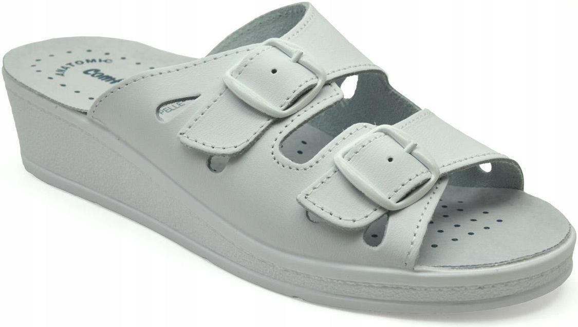 Comfooty Mia White Klapki Medyczne COMFOOTY MIA WHITE wyróżnia profilowana podeszwa i cholewka stabilizująca obustronnie stopę . Stwarza to komfort dla stopy przy długotrwałym użytkowaniu klapka. Podeszwa klapka wykonana jest z poliuretanowej amortyzującej pianki pokrytej miękką wyściółką z naturalnej skóry. Klapki to wygodne lekkie obuwie polecane do pracy (w branży medycznej, kosmetycznej, przemyśle, gastronomii, handlu), zarówno stojącej, jak i siedzącej, a także na co dzień - świetnie sprawdzą się przy domu, czy na działce. Klapki te to obuwie w klasycznym stylu, o ponadczasowym wyglądzie. Posiadają paski ze stopniową regulacją ułożenia stopy co pozwala dopasować ją do podeszwy. Dzięki regulowanym paskom istnieje możliwość dopasowania obuwia do stopy. cholewka - skóra naturalna regulowana na sprzączkach, wyściółka - skóra naturalna, Podeszwa dolna wykonana jest z pianki poliuretanowej. 36 - 23 cm 37 - 23,5 cm 38 - 24 cm 39 - 25 cm 40 - 25,5 cm 41 - 26.5 cm 42 - 27 cm Pamiętaj, że kupując od e-klapki Zawsze uzyskasz pomoc - jeżeli nie jesteś pewien, jaki model lub rozmiar wybrać służymy pomocą i błyskawicznie odpowiadamy na zapytania Każdy zakupiony produkt możesz wymienić lub zwrócić, bo Twoje zadowolenie i komfort stóp są dla nas priorytetem Gwarantujemy bezpieczne zakupy