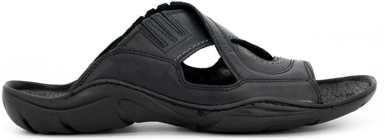 Klapki męskie 400 czarne Rozmiar buta to 46 a długość wkładki to 31 cm Klapki męskie w sportowym stylu spodobają się panom bez względu na wiek. To ten rodzaj obuwia, który po prostu powinien mieć każdy, ponieważ sprawdzą się zarówno podczas wakacyjnego wyjazdu, jak i jako letnie obuwie domowe i weekendowe. Atutem tego wyboru jest wykonanie klapek stuprocentowo ze skóry naturalnej. To znakomity komfort dla stóp, nawet jeżeli klapki zakładane są bezpośrednio na bose stopy. Przyjemny w dotyku materiał daje wrażenie chodzenia boso, ale jednocześnie dobrze izoluje od podłoża. Klapki męskie dostępne są w neutralnych kolorach, dlatego łatwo jest dobrać je do swojej stylizacji. Są lekkie i nie zajmą z pewnością wiele miejsca w bagażu. Wyprodukowane są przez polskiego producenta, co jest gwarancją jakości. Klapki męskie są także proste w utrzymaniu ich w czystości i nie wymagają specjalnych zabiegów pielęgnacyjnych. Profilowana wkładka wewnętrzna dobrze podtrzymuje podeszwę stopy. Ich prosty wygląd jest uniwersalny.