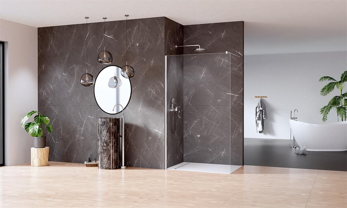 NEW TRENDY Kabina Walk In NESTA 90 Szkło 8mm Niezwykle prosta, a zarazem ciekawa konstrukcja produktu zapewnia jego interesujący wygląd, uzupełniony wysoką jakością materiałów i wykonania. Szkło hartowane uzupełniają delikatne, ale stabilne profile i elegancki wspornik. Kabina uniwersalna, możliwy montaż jako lewa lub prawa Wymiary rzeczywiste do zewnętrznej krawędzi kostki przyściennej: Zakres regulacji A 87,7-89,2 cm Wymiar B max 120 cm Wysokość H 200cm Wykończenie koloru chrom połysk GWARANCJA 3 LATA Cechy produktu Szkłoprzeźroczyste,hartowane o grubości 8 mm pokryte powłoką ActiveShield 2,0, ułatwiającą utrzymanie kabiny w czystości Elegancki profil przyścienny umożliwiająca niwelację krzywizn ściany do 10mm Prosty i elegancji wspornik górny Bezprogowe wejście możliwy montaż na brodzik lub na posadzkę Powłoka przeciwosadowa ActivShield 2.0 ułatwiającą utrzymanie kabiny w czystości Powłoka Active Shield 2.0 - w standardzie powłoka uszlachetniająca powierzchnię szkła nakładana mechanicznie i utrwalana promieniami UV i IR. Wydłuża to jej żywotność nawet do dziesięciu lat pod warunkiem eksploatacji zgodnie z zaleceniami posiada ona właściwości hydrofobowe, dzięki czemu krople wody nie utrzymują się na powierzchni szkła, tylko spływają, nie pozostawiając osadów aby długo cieszyć się zaletami powłoki Active Shield wystarczy po każdej kąpieli spłukać szkło wodą zaleca się stosowanie środków do pielęgnacji kabin prysznicowych dostępnych w naszej ofercie New Trendy Możliwość montażu - na brodzik - na posadzkę