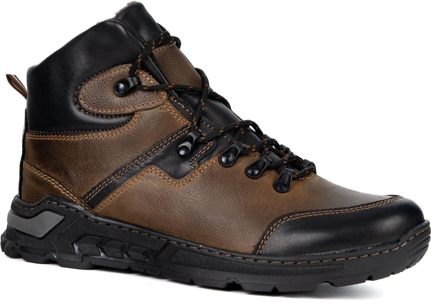 Męskie trzewiki skórzane Olivier 615KNT – półwysokie obuwie trekkingowe za kostkę Model Olivier 615KNT to męskie skórzane trzewiki o trekkingowym charakterze, stworzone jako półwysokie buty za kostkę do codziennych wyjść i lekkich aktywności w terenie. Naturalna skóra wierzchnia, stabilna cholewka i podeszwa inspirowana obuwiem outdoorowym sprawiają, że to uniwersalna propozycja na sezon jesienno-wiosenny. Model łączy klasyczne sznurowanie, haczyki ułatwiające wiązanie oraz mocne przeszycia, co pozwala na pewny krok w zróżnicowanych warunkach. Kluczowe cechy modelu półwysoka konstrukcja za kostkę naturalna skóra wierzchnia podeszwa inspirowana trekkingiem klasyczne wiązanie z metalowymi haczykami stabilizacja kostki podczas chodzenia model przejściowy (miasto + lekkie tereny) Olivier 615KNT – praktyczne trzewiki o trekkingowej konstrukcji Model 615KNT łączy miejski charakter z funkcjonalnością znaną z butów outdoorowych. Skóra naturalna dobrze dopasowuje się do stopy, a półwysoka konstrukcja wspiera kostkę podczas chodzenia po zróżnicowanej nawierzchni. To obuwie, które sprawdzi się w codziennym użytkowaniu, na dojazdach, spacerach i weekendowych aktywnościach. Stabilna podeszwa i konstrukcja stworzona do ruchu Podeszwa wzorowana na modelach trekkingowych zapewnia pewniejszy krok, szczególnie na nierównych podłożach. Karbowana struktura zwiększa przyczepność, a mocne przeszycia wzmacniają całość konstrukcji. Sznurowanie z haczykami umożliwia precyzyjne dopasowanie obuwia do tęgości stopy. Skóra naturalna, która pracuje ze stopą Zastosowana skóra naturalna dopasowuje się do użytkownika i zachowuje swój charakter przez dłuższy czas. Po kilku dniach noszenia staje się bardziej elastyczna, co poprawia komfort i stabilność obuwia w codziennych warunkach.