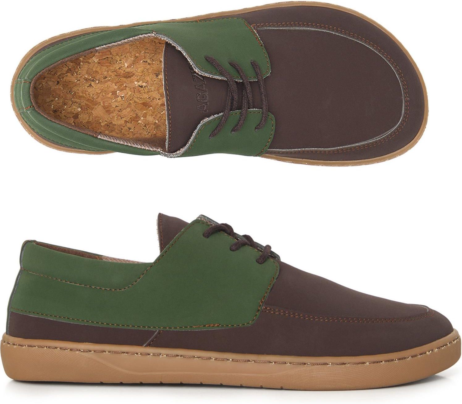 Wegańskie buty barefoot AGAZI AG28 – zielono-brązowe mokasyny z roślinnej skóry Mordy
