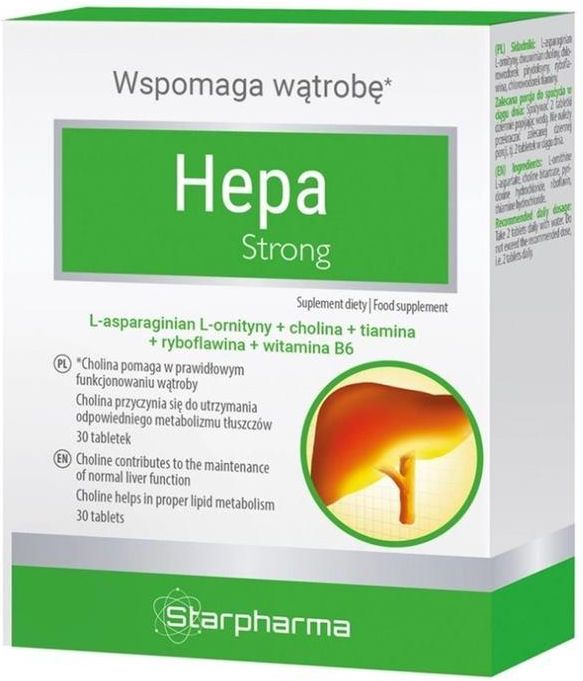 Hepa Strong Starpharma to suplement diety w tabletkach zawierający ekstrakt z nasion ostropestu plamistego standaryzowany na sylimarynę, cholinę oraz witaminy z grupy B. Wspiera prawidłowe funkcjonowanie i regenerację wątroby, a także przyczynia się do utrzymania prawidłowego metabolizmu tłuszczów. Skład Ekstrakt z nasion ostropestu plamistego (Silybum marianum L.) – 200 mg, w tym sylimaryna Cholina – 82,5 mg Witamina B6 – 1,4 mg (100% RWS*) Witamina B12 – 2,5 µg (100% RWS*) Substancje pomocnicze: celuloza mikrokrystaliczna, skrobia, substancje przeciwzbrylające, substancje glazurujące – zgodnie z deklaracją producenta *RWS – Referencyjna Wartość Spożycia Działanie Sylimaryna wspiera procesy regeneracyjne i ochronne komórek wątroby Cholina przyczynia się do utrzymania prawidłowego metabolizmu tłuszczów oraz funkcji wątroby Witaminy B6 i B12 wspierają prawidłowy metabolizm energetyczny i funkcjonowanie układu nerwowego Preparat wspomaga naturalne procesy detoksykacyjne organizmu Wskazania do stosowania Wsparcie pracy i regeneracji wątroby Uzupełnienie diety w sylimarynę, cholinę i witaminy z grupy B Dla osób narażonych na czynniki obciążające wątrobę (dieta, stres, leki) Sposób użycia 1 tabletka dziennie, najlepiej podczas posiłku, popijając wodą. Przeciwwskazania Nadwrażliwość na którykolwiek składnik suplementu Nie stosować u dzieci, kobiet w ciąży i karmiących piersią bez konsultacji z lekarzem Środki ostrożności i możliwe działania niepożądane Nie przekraczać zalecanej porcji do spożycia w ciągu dnia Suplement nie zastępuje zdrowej, zróżnicowanej diety U osób wrażliwych może powodować łagodne dolegliwości żołądkowo-jelitowe Przechowywanie Przechowywać w temperaturze pokojowej, w suchym miejscu, w szczelnie zamkniętym opakowaniu, w miejscu niedostępnym dla dzieci.
