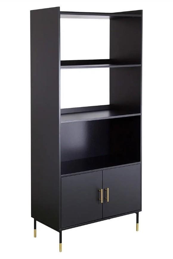 Regał Tedy czarny - minimalistyczny, elegancki design Czarny regał Tedy z czterema półkami to minimalistyczny, pojemny mebel, który nie tylko pomieści wiele przedmiotów, ale sam w sobie będzie ozdobą wnętrza. Dwie półki bez tylnej ścianki przepuszczają światło, gdy np. regał ustawiony jest jako element oddzielający salon od jadalni. Ten nowoczesny mebel dzięki swojemu ponadczasowemu wyglądowi i konstrukcji będzie pasował do wnętrz Modern glamour i nie tylko. Nie zastanawiaj się dłużej i wybierz regał marki Atmosphera! Wprowadź odrobinę stylu i praktyczności do swojego domu dzięki regałowi Tedy w kolorze czarnym! Ten elegancki i minimalistyczny mebel z pewnością stanie się centralnym punktem każdego pomieszczenia, w którym zostanie umieszczony - i jest nie tylko piękny, ale również bardzo funkcjonalny. Regał wykonany z doskonałej płyty MDF, która charakteryzuje się wytrzymałością na uszkodzenia, a dodatkowo jest łatwa w czyszczeniu. Tedy posiada cztery przestronne półki, które ilustrują doskonałą harmonię między pięknem i koniecznością. Jego elegancki czarny fornir zapewnia przyciągający wzrok wygląd, który łatwo wkomponuje się w każdy nowoczesny wystrój. Dwie środkowe półki są otwarte, aby światło mogło unosić się w całej przestrzeni, podczas gdy dolna półka i szafka zapewniają dodatkowe miejsce do przechowywania książek, fotografii i innych przedmiotów. Zwieńczeniem tego ponadczasowego elementu są złote metalowe nogi i uchwyty, które nadają meblu wyrafinowania. Regał to jeden z elementów kolekcji Tedy marki Atmospehra. Stylowy, wygodny - to wszystko, czego potrzebujesz w jednym. Więc po co czekać? Zakup do domu czarny regał Tedy już dziś! Przygotuj się na mądry wybór! Regał Tedy to minimalistyczny, pojemny mebel, który pomieści wiele przedmiotów. Regał wykonany jest z trwałej płyty MDF i pokryty okleiną w kolorze czarnym. Dwie półki nie posiadają tylnej ściany, dzięki czemu przez regał może przechodzić światło. Dolna półka i szafka posiadają tylną ściankę. Szafka wyposażona jest w złote, metalowe uchwyty. Nogi regału są metalowe ze złotymi elementami. Ten zgrabny, stylowy regał sprawi, że Twój dom będzie wyglądał szykownie i nowocześnie. Sprawdzi się idealnie w biurze, salonie czy sypialni. Pokochasz możliwość wyeksponowania wszystkich swoich ulubionych książek na tym pięknym meblu!