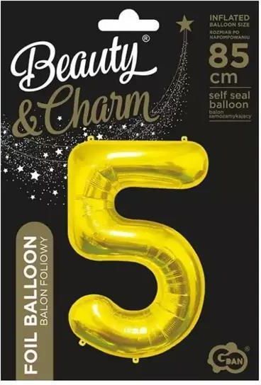 Balon Foliowy w Kształcie Cyfry 5 - Złotej Prezentujemy Państwu balon foliowy w kształcie cyfry 5, wykonany w złotej kolorystyce. Po napompowaniu osiąga wymiar 85 cm, co sprawia, że będzie się doskonale prezentować na różnego rodzaju przyjęciach i imprezach. W opakowaniu znajduje się 1 sztuka balonu, który pochodzi z eleganckiej kolekcji Beauty&Charm, renomowanego producenta balonów - GoDan. Warto zaznaczyć, że balony te przeznaczone są przede wszystkim do napełnienia helem, ponieważ tylko wtedy będą się unoszyć. Użycie powietrza do napełnienia balonów spowoduje, że nie będą one spełniać swojej podstawowej funkcji, a więc unoszenia się. Kupując balon otrzymują Państwo produkt niezapompowany, czyli taki, który nie jest jeszcze pełen helu ani powietrza. Atutem tego produktu jest zawór samozamykający, który znacznie ułatwia proces napełniania i zamykania balonu. Dzięki temu balon foliowy będzie nie tylko pięknie się prezentować, ale także praktyczny i łatwy w obsłudze. EAN: 5902973180985
