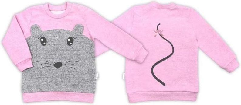 Bawełniana bluza dziewczęca szaro-różowa. Motywem przewodnim modelu jest mała, urocza myszka. Przeważająca część różowego przodu pokrywa szary wizerunek uszatej myszki. Na gładkim tyle umieszczono nadruk ogonka z kokardką ze wstążki. Dół i rękawki wykończone delikatnym ściągaczem. Na lewym ramionku dwie napy ułatwiające zakładanie bluzy. Rozmiar: 68 cm Obwód klatki piersiowej: 49 cm
