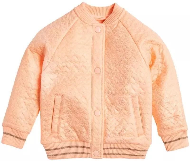 Rozpinana, pikowana bluza dla dziewczynki: 35% bawełna, 65% poliester kolor brzoskwiniowy pokryty złotym brokatem dół i rękawy zakończone ściągaczem zapięcie na metalowe zatrzaski Pielęgnacja: Prać oddzielnie w temperaturze do 30° C. Prać i prasować po lewej stronie. Tkanina może farbować. Należy zachować ostrożność w użytkowaniu z odzieżą w jasnych kolorach.