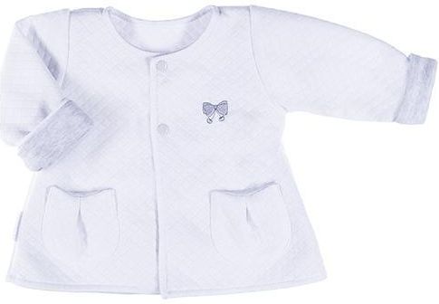 Bluza dziewczęca z kolekcji "Elegant" uszyta z miękkiej i przyjemnej w dotyku pikowanej białej dzianiny z melanżową podszewką. Elementem ozdobnym jest mała haftowana kokardka oraz kieszonki. Bluza jest zapinana na bezniklowe napki, posiada wygodne wywijane rękawki. Wyprodukowana w Polsce, posiada certyfikat "Bezpieczny dla dziecka". 100% bawełna