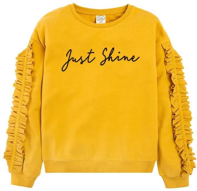 Bluza dla dziewczynki: - kolor: żółty - napis: Just shine - na rękawach doszyte falbanki - dół i rękawy ze ściągaczem Materiał i technologie: - 100% bawełna (gramatura: 260 g/m2) - peach effect - delikatny i miękki w dotyku materiał Pranie i pielęgnacja: - Prać z podobnymi kolorami w temperaturze do 40° C. - Prać i prasować po lewej stronie.