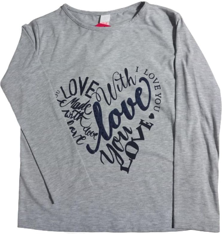 Bluzka dziewczęca z długim rękawem. W centralnej części przodu nadrukowane napisy układające się w kształt serca. Największy z napisów LOVE ozdobiony cyrkoniami w kolorze granatowym, w trzech rozmiarach. Najwyższej jakości bawełna z domieszką elastanu zapewnia trwałość i komfort noszenia. Obwód klatki piersiowej: 72 cm
