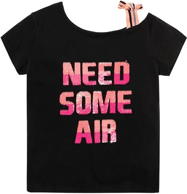 - bluzka z krótkim rękawem dla dziewczynki - 100% bawełna (gramatura: 155 g/m2) - certyfikat Oeko-Tex Standard 100 - kolor: czarny - cekinowy napis "Need Some Air" - obniżony dekolt - wiązana tasiemka na ramieniu - kolekcja: Africa - pielęgnacja: prać z podobnymi kolorami w temperaturze do 40° C. Prać i prasować po lewej stronie.