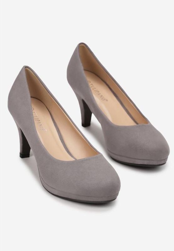 Czółenka Hicinne wykonane z ekozamszu, o gładkim i jednolitym zdobieniu. Osadzone na stożkowym obcasie. Wsuwane, z zaokrąglonym noskiem. Wewnątrz wkładka z ekoskóry. Przy zakupie zalecamy wybór rozmiaru o 1 większy. - Kolor: Szary - Tęgość stopy: Neutralny - Rodzaj obcasa: Stożek - Wkładka/wyściółka: Ekoskóra - Materiał: Ekozamsz - Nosek buta: Okrągły - Zapięcie: Wsuwany/otwarty - Sezon: Całoroczny - Wysokość obcasa: 7cm