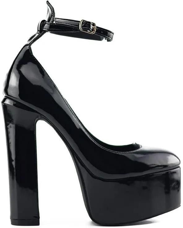 Cechy sprzedawanych butów: - Kolor: Czarny - Wysokość obcasa - cm: 15 - Podbicie platforma - cm: 5 - Wzór dominujący: Bez wzoru - Typ Buta: Buty na platformie, Buty na słupku - Typ noska: Okrągły - Typ zapięcia: Sprzączka - Materiał zewnętrzny: Skóra ekologiczna - Rodzaj połysku: Lakierki - Cechy dodatkowe: Lakierowane