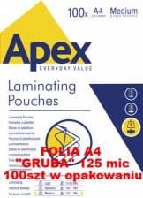 Folia do laminatora A4 125 mic APEX medium SUPER CENA !!! Folie do laminacji, laminowania stanowią ochronę dokumentów przed wilgocią, kurzem i zabrudzeniem. Zabezpieczają też je przed ewentualną interwencją w jego treść. Laminowanie zdjęć poprawia ich kolorystykę, zabezpiecza przed pozostawianiem śladów, zalaniem. Folie do laminatora o grubości 125 mikronów są przeznaczone do laminacji notatek, dokumentów, zdjęć, rysunków itp. Zapewniają dokumentom doskonałą ochronę i wygląd Format A4, pakowane po 100 szt. Grubość 125 mikronów Folia laminacyjna produkowana przez Fellowes