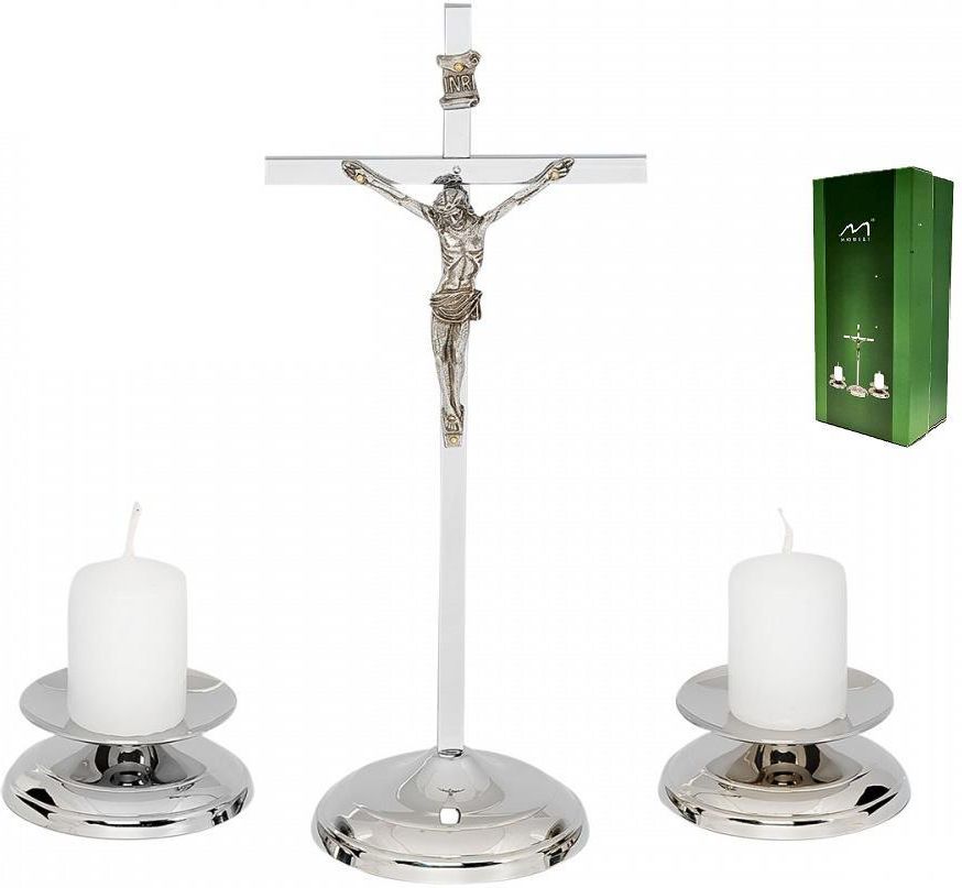W skład zestawu wchodzą : Krzyż stojący wysokość 260 mm - 1 szt Świecznik wysokość 35 mm - 2 szt Świeca biała wysokość 55mm - 2 szt Zestaw zapakowany jest w eleganckie pudełko w kolorze zielonym Produkt najwyższej jakości, wyprodukowany w Polsce.
