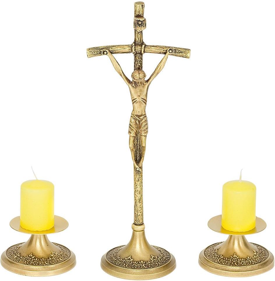 Zestaw kolędowy "papieski" duży,kolor stare złoto (odlew ze stopu cynku, pokryty powłoka galwaniczną ) Wysoka jakość, produkt polski. W skład zestawu wchodzą: krzyż stojący h 310 mm - 1 szt. świecznik h 50 mm - 2 szt. Zestaw zapakowany jest w eleganckie pudełko.