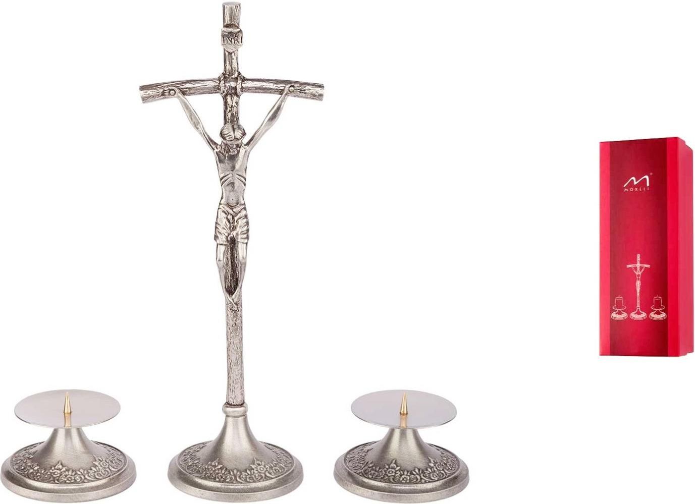Zestaw kolędowy "papieski" duży, kolor stare srebro (odlew ze stopu cynku, pokryty powłoką galwaniczną ) Wysoka jakość, produkt polski. W skład zestawu wchodzą: krzyż stojący h 310 mm - 1 szt. świecznik h 50 mm - 2 szt. Zestaw zapakowany jest w eleganckie pudełko.