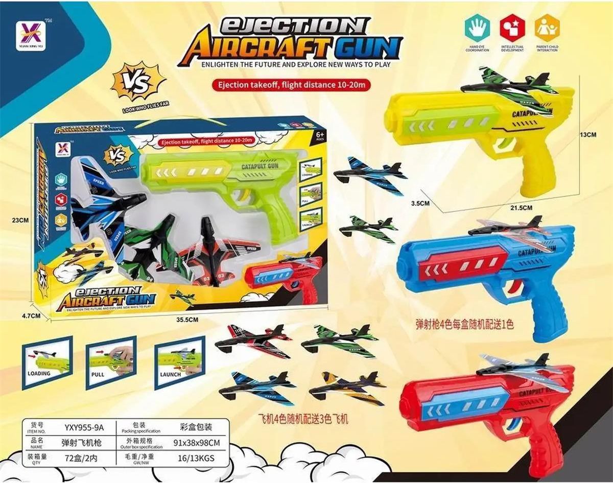 Fascynująca wyrzutnia samolotów Ejection Aircraft Gun to doskonała zabawka, która łączy zabawę z nauką aerodynamiki. Zestaw pozwala dzieciom wystrzeliwać miniaturowe samoloty na odległość do 10-20 metrów, zapewniając godziny ekscytującej rozrywki na świeżym powietrzu.Opis produktu:Wyrzutnia Aircraft Gun to innowacyjna zabawka edukacyjna, która rozwija koordynację wzrokowo-ruchową i zrozumienie podstaw fizyki lotu. Zestaw zawiera kolorową wyrzutnię w kształcie pistoletu oraz miniaturowe samoloty do wystrzeliwania. Mechanizm ejection takeoff umożliwia łatwe ładowanie i wystrzeliwanie samolotów jednym naciśnięciem spustu. Solidna konstrukcja z wysokiej jakości plastiku zapewnia długotrwałą zabawę, a ergonomiczny uchwyt gwarantuje wygodne trzymanie. Zabawka idealnie nadaje się do zabawy w ogrodzie, parku czy na plaży, rozwijając jednocześnie umiejętności motoryczne i wyobraźnię przestrzenną dzieci.Najważniejsze cechy: Zasięg lotu – samoloty osiągają odległość 10-20 metrów Wymiary opakowania – 35,5 x 23 x 4,7 cm, kompaktowe przechowywanie Wiek – od 6 lat, bezpieczna zabawa dla dzieci szkolnych Certyfikaty – posiada oznaczenia bezpieczeństwa zgodne z normami Materiał – wytrzymały plastik ABS, odporny na uszkodzenia Korzyści edukacyjne – nauka aerodynamiki, koordynacja i precyzja Zastosowanie – idealna do zabawy na zewnątrz, w parku lub ogrodzie