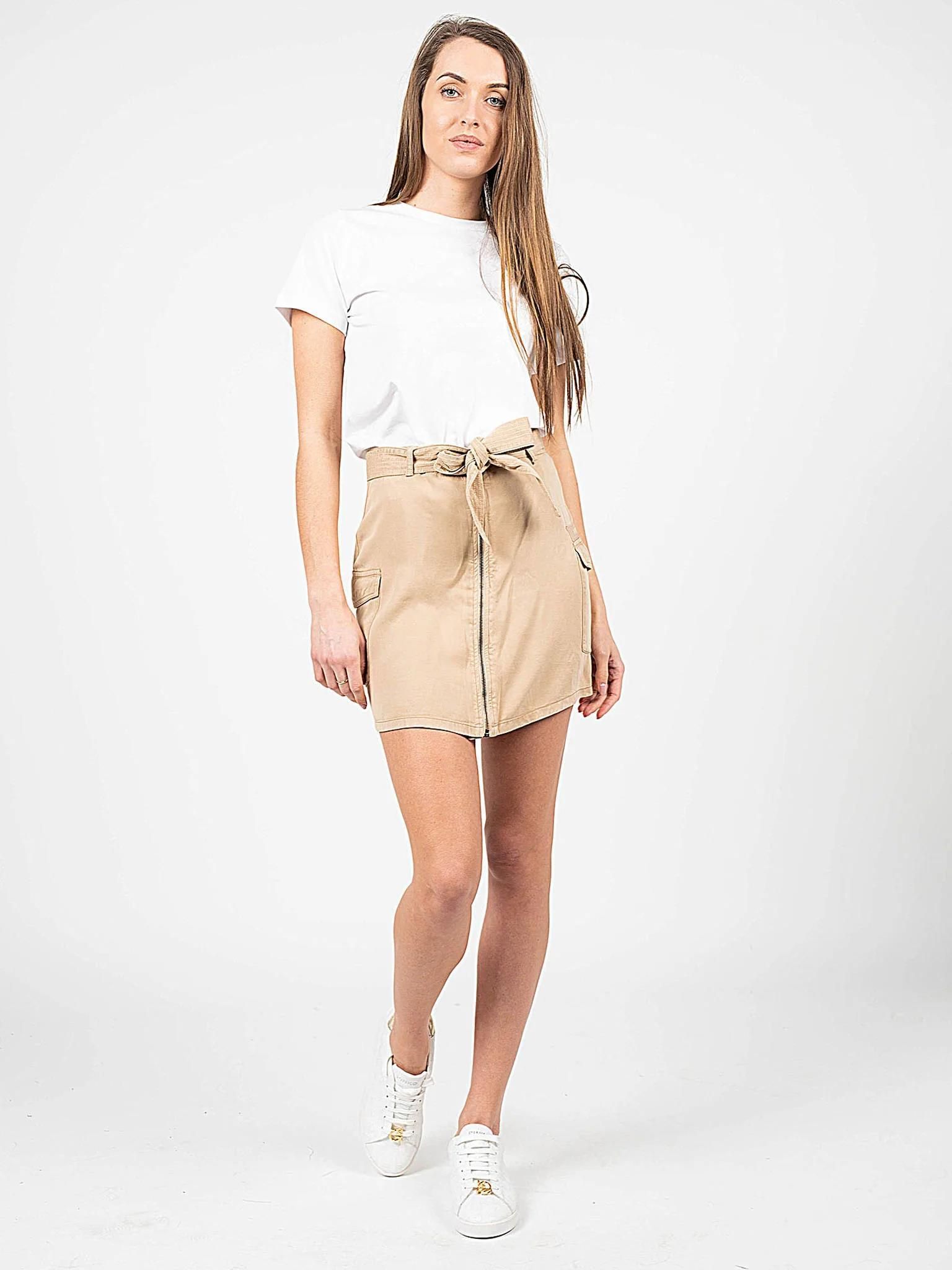 Dopasowany fason o długości mini, do połowy uda Zapinana na sygnowany zamek błyskawiczny oraz guzik Po bokach dwie kieszenie z patkami Z lewej strony naszywka z nazwą marki Z dołączonym paskiem Wykonana z wysokiej jakości tkaniny