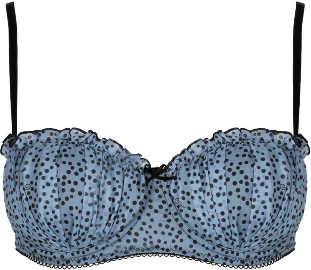 Balkonetka Z fiszbinami Delikatnie usztywniane miseczki Z tyłu zapięcie z możliwością regulacji Regulowane ramiączka W kropki Góra ozdobiona falbanką Na miseczkach marszczenia Wykonany z wysokiej jakości tkaniny