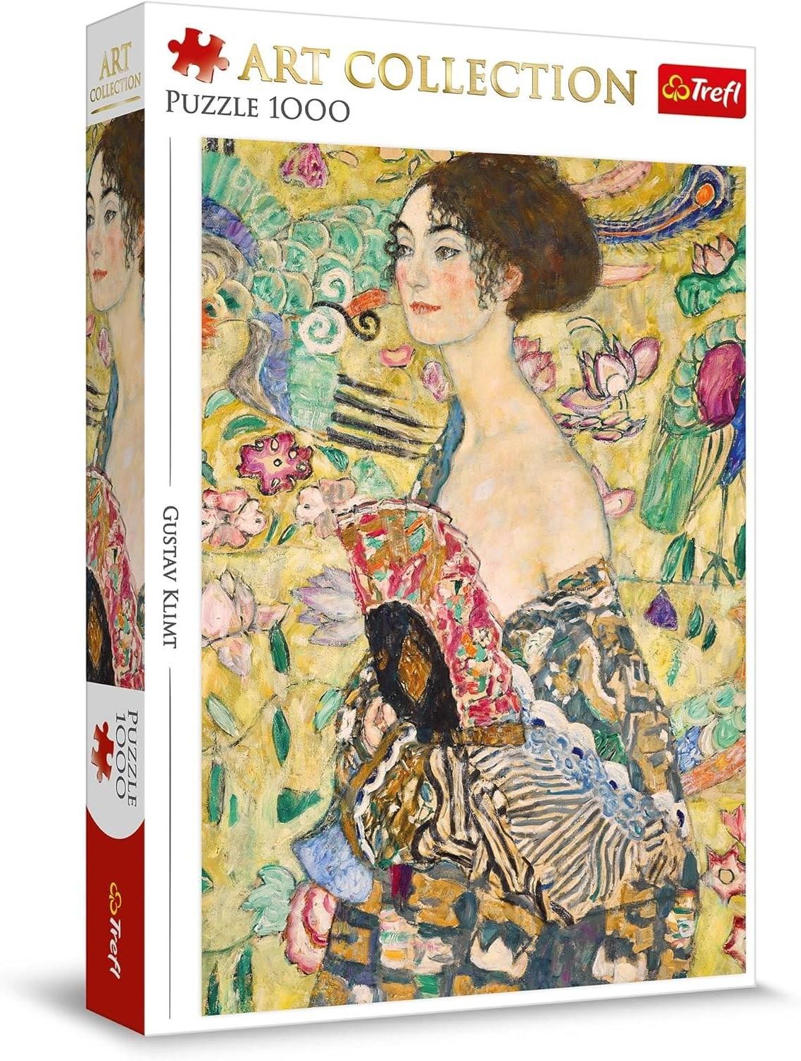 Trefl Puzzle 1000el. Gustav Klimt, Dama z Wachlarzem 93756 Puzzle 1000 elementów, idealne dla miłośników układanek, pozwolą stworzyć obraz o wymiarach 683 x 480 mm ukazujący znane dzieło Dama z wachlarzem, które namalował Gustav Klimt. Produkt został wykonany w Polsce z wysokiej jakości materiałów i z dbałością o środowisko. Ponadto puzzle pokryto specjalnym kalandrowanym papierem odbijającym światło, który ułatwia układanie. Puzzle produkowane od lat! Od 1985 roku w Trefl SA poświęcamy się temu, aby zagwarantować niezapomniane doznania podczas układania puzzli, które produkowane są w 100% w Polsce. Nasze układanki tworzymy z pasją, a każdy element cechuje wysoka jakość wykonania.  Dzięki wykorzystaniu papieru niwelującego odbicie światła, sprawiamy, że układanie staje się jeszcze przyjemniejsze. Po ułożeniu puzzli możesz utrwalić obrazek klejem i powiesić swoje dzieło na ścianie.  Zalety układania puzzli Puzzle to świetna rozrywka dla każdego, niezależnie od wieku czy umiejętności. To także dobry trening dla umysłu i ciała. Układając, wyrównujemy oddech, tempo bicia serca oraz spada ciśnienie krwi. Kompletowanie układanki uczy cierpliwości i wytrwałości, co przekłada się na umiejętności przydatne w codziennym życiu. Odkryj nową pasję już dziś! Szukasz pomysłu na miły wieczór w domowym zaciszu? Układanie puzzli to świetny sposób na spędzenie wolnego czasu w gronie przyjaciół i rodziny a do tego rewelacyjny trening dla mózgu. Szeroki wybór wzorów pozwala wybrać układankę dopasowaną do Twoich zainteresowań. Puzzle są doskonałym prezentem z okazji urodzin lub świąt. Odkryj Niezbędnik Puzzlomaniaka!