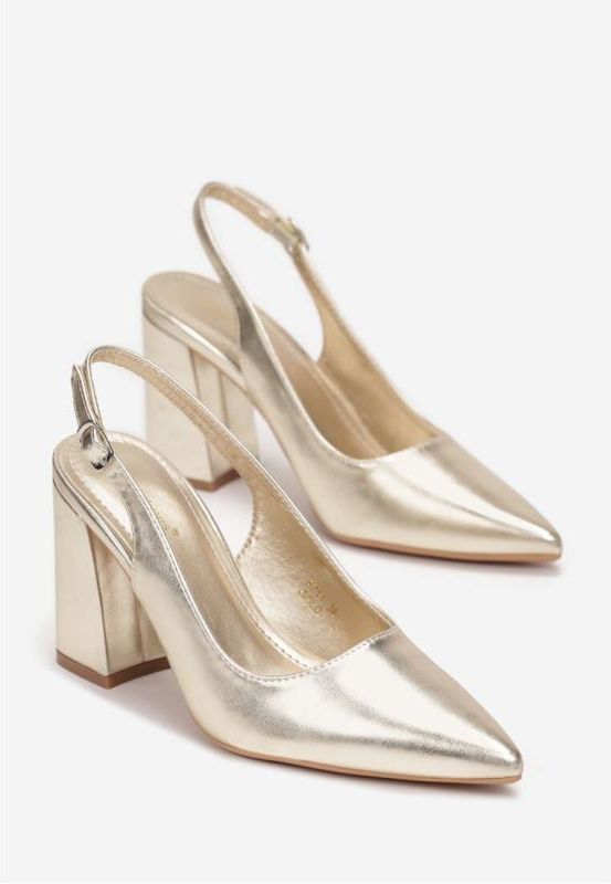 ZŁOTE CZÓŁENKA ZE SZPICZASTYM NOSKIEM NA SŁUPKU I ODKRYTĄ PIĘTĄ ROZMIAR 40 Mosina