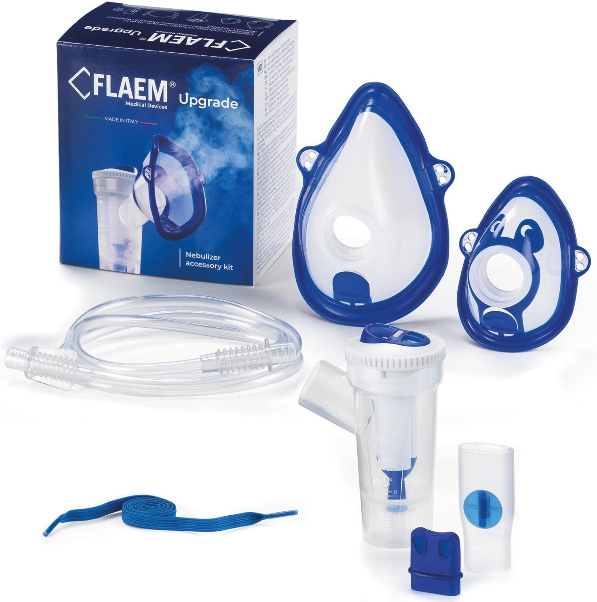 FLAEM UPGRADER Zaawansowany technologicznie zestaw akcesoriów z nebulizatorem RF7 Dual Speed Plus Dwie prędkości inhalacji Nebulizacja wspomagana wdechem Innowacyjne Maski Soft Touch z ogranicznikiem rozproszenia mgiełki Bez bisfenolu i ftalanów Parametry przetestowane przez TÜV Rheinland Zwiększ wydajność i wygodę nebulizacji z zestawem Flaem Upgrade Jakość nebulizacji zależy od stanu technicznego akcesoriów, które na skutek regularnego użytkowania ulegają zużyciu, zmniejszając skuteczności terapii. Zestaw Flaem Upgrade zapewnia jakość inhalacji na najwyższym poziomie, dopasowując się do wszystkich urządzeń Flaem Nuova, w tym inhalatorów Novama by Flaem. Flaem Upgrade zawiera nowoczesny nebulizator RF7 Dual Speed Plus, który umożliwia dwukrotne przyspieszenie inhalacji, zachowując niskie i stabilne MMAD cząsteczek. Jest to szczególnie istotne dla skutecznego dostarczania mgiełki do dolnych dróg oddechowych. Zestaw pozwoli utrzymać higienę terapii inhalacyjnej i zapewni wygodne warunki użytkowania dla całej rodziny. Wyprodukowany w Europie, bez szkodliwych BPA i ftalanów, Flaem Upgrade to klucz do osiągnięcia wysokiej jakości i skuteczności inhalacji. Dwie prędkości inhalacji, bez utraty jakości mgiełki. Nebulizator RF7 Dual Speed Plus dzięki dwóm trybom pracy umożliwia szybką i skuteczną nebulizację, również leków specjalistycznych. Ponad dwukrotne przyspieszenie inhalacji w trybie MAX zwiększa komfort kuracji, w szczególności dla niecierpliwiących się dzieci lub przewlekle chorych pacjentów, nie tracąc przy tym na jakości mgiełki. Mały rozmiar cząsteczki MMAD Precyzyjna geometrycznie budowa nebulizatora RF7 Dual Speed Plus pozwala osiągnąć wielkość cząsteczek MMAD docierającą do najgłębszego zakresu dolnych dróg oddechowych zapewniając skutecznie wspomagając leczenie nawet najbardziej uciążliwych schorzeń. Wysoka frakcja respirabilna Kluczowym wskaźnikiem skuteczności inhalacji dolnych dróg oddechowych jest frakcja respirabilna (FPF), wskazująca procent cząsteczek wytwarzany przez inhalator o odpowiednim rozmiarze dla odpowiedniego wchłonięcia przez organizm. Nebulizator zawarty w zestawie, w zależności od wykorzystywanego kompresora, osiąga od 74,7% do 84,2% FPF, zapewniając maksymalny efekt terapeutyczny. Nebulizacja wspomagana wdechem Nebulizacja wspomagana wdechem to technika inhalacyjna, która polega na dostarczeniu mgiełki nebulizacyjnej w synchronizacji z oddechem pacjenta. Dzięki zaworom w nebulizatorze aerozol dociera do chorego wyłącznie podczas wdechu, minimalizując straty leku. Jest to znaczące ulepszenie w porównaniu do tradycyjnej nebulizacji, gdzie mgiełka podawana jest w sposób ciągły, niezależnie od fazy oddechu, tym samym marnując cenny lek. Dopasowany dla całej rodziny Pełne wyposażenie Flaem Upgrade sprawia, że jest to zestaw idealny dla użytkowników w każdym wieku - ustnik z zaworem, upraszczający wdychanie, uniwersalna nakładka do nosa oraz maski w dwóch rozmiarach, dla dzieci i dorosłych, zapewnią dopasowaną i wygodną inhalację. Innowacyjne maski w dwóch rozmiarach Maski Flaem, wykorzystujące technologię Soft Touch to specjalistyczne akcesoria z krawędzią wykonaną z miękkiego biokompatybilnego materiału, dopasowującą się bez nieprzyjemnego ucisku, jednocześnie zapewniając szczelną barierę. Komfort przy inhalacji dziecka z użyciem maski zapewnią gumki, które pozwalają utrzymać maskę we właściwej i wygodnej pozycji. Zmniejszenie utraty mgiełki Zabezpieczeniem przed utratą leku jest wbudowany ogranicznik rozproszenia mgiełki - otwierający i zamykający się zawór w ustniku i w maskach, zsynchronizowany z fazami wdechu i wydechu, który dzięki swojemu działaniu precyzyjnie kieruje mgiełkę leku, zwiększając wydajność i bezpieczeństwo terapii. Bezpieczny i przetestowany Parametry mgiełki zostały potwierdzone testami in vitro przez TÜV Rheinland Italia S.r.l., niezależną stronę trzecią, we współpracy z Uniwersytetem w Parmie. Wszystkie akcesoria Flaem są zgodne z normą europejską EN 10993-1 i rozporządzeniem (UE) 2017/745. Bez bisfenolu i ftalanów Bisfenol i ftalany to substancje chemiczne, które mogą negatywnie wpływać na zdrowie. Wybierając produkty FLAEM, masz pewność, że są wolne od szkodliwego bisfenolu i ftalanów, a także zgodne z europejskimi regulacjami (Rozporządzenie WE - nr 1907/2006). Prosta higienizacja Ułatwienie czyszczenia to podstawa – nebulizator i akcesoria są łatwe w demontażu, a wysoka jakość produktu pozwala na zdezynfekowanie zestawu, np. gotując 10 minut w wodzie demineralizowanej lub destylowanej Skład zestawu: Przewód powietrzny – 1 metr Nebulizator RF7 Dual Speed Plus Ustnik z zaworem Końcówka do nosa Maska Soft Touch mała Maska Soft Touch duża