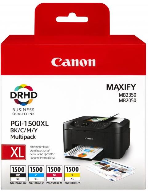Canon PGI-1500XL  BK/C/M/Y Niższe wydatki na atrament i większy komfort pracy dzięki wielopakowi XL z atramentem o dużej gęstości, który zapewnia trwałe wydruki  Wyraźny. Trwały. Do druku biznesowego. Oszczędź do 15% na atramencie Zawiera kasety w kolorze czarnym, błękitnym, amarantowym i żółtym Ten wielopak pozwala oszczędzić czas i pieniądze. Zawiera pełny zestaw zbiorników z atramentem XL dla Twojej drukarki: błękitny, amarantowy, żółty i czarny. Pigmentowe atramenty DRHD generują dokumenty biznesowe o profesjonalnej jakości za każdym razem. Umożliwia wydrukowanie maks. 1200 stron dokumentów formatu A4 w czerni lub 1020 stron dokumentów formatu A4 w kolorze, zgodnie z normą ISO/IEC 24711 Korzyści: Oryginalny atrament firmy Canon generuje wydruki średnio o 35% lepszej jakości niż alternatywne kasety z atramentem Oryginalny atrament firmy Canon gwarantuje spójną jakość wydruków za każdym razem Oryginalny atrament firmy Canon jest niezawodny, więc drukowanie nie jest tak stresogenne Zużyte kasety na toner lub atrament można zwrócić w celu ich ponownego wykorzystania lub recyklingu. Usługa jest bezpłatna, prosta i ekologiczna. Zgodność: MAXIFY MB2050 MAXIFY MB2750 MAXIFY MB2350 MAXIFY MB2755 MAXIFY MB2155 MAXIFY MB2150