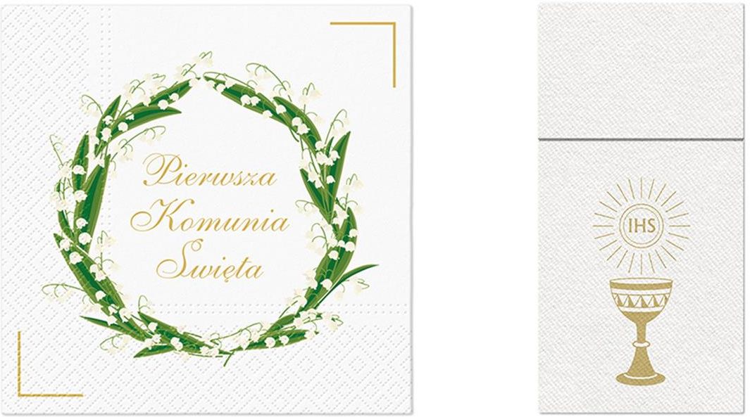 Zestaw dekoracji na stół na I Komunię Świętą. W komplecie: - 20 serwetek 3-warstwowych z konwaliami i złotym napisem - 33 cm (po rozłożeniu), - 25 kieszonek na sztućce ze złotym nadrukiem IHS - 40 x 40 cm (po rozłożeniu).