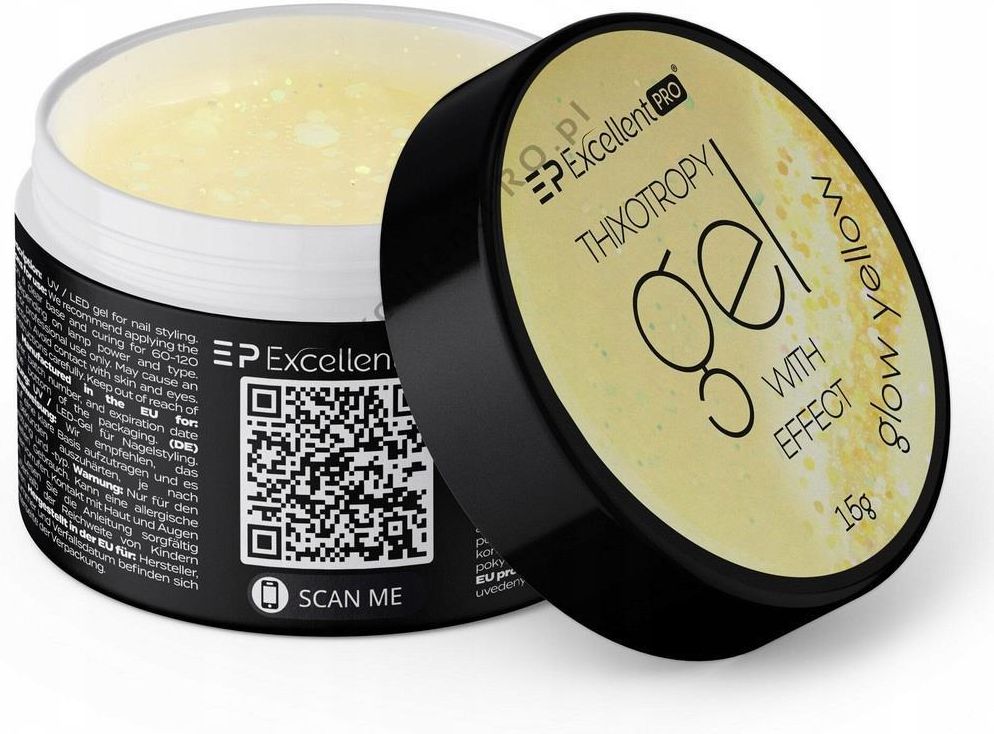 Żel Excellent PRO TIXO WITH EFFECT 15g GLOW YELLOW EXCELLENT PRO THIXOTROPY GEL WITH EFFECT GLOW YELLOW to pastelowo żółty żel z dodatkiem różnokolorowych drobin o różnych kształtach i różnej wielkości. Dodatek brokatu pozwoli na wykonanie stylizacji bez konieczności użycia hybryd, co znacznie skróci czas wykonania manicure. Twardy żel, który świetnie nadaje się do utwardzenia naturalnej płytki, a także do budowania i przedłużania na szablonie oraz tipsie. Doskonale sprawdzi się także w stylizacjach wykonywanych przy pomocy dual form. Samopoziomująca się formuła o właściwościach tiksotropowych sprawi, że praca nim będzie przyjemna i szybka, bez obaw o zalanie skórek. Podczas fotopolimeryzacji nie odkształca się, a zaciśnięty tunel nie rozpręża się. Bardzo odporny na uszkodzenia mechaniczne żel gwarantuje, że stylizacja będzie niezwykle trwała. Uwaga! Aby uzyskać jak najlepszą przyczepność żelu oraz ze względu na zawartość drobiny, przed nałożeniem zalecamy nałożyć przeźroczystą bazę. Rekomendujemy użycie Excellent PRO One Coat Multifunction Grafen Base. Specyfikacja: Twardość: Twardy Poziom krycia: 70% Konsystencja: Gęsty Szybkość poziomowania: Średnia Przeznaczenie: Krótkie, długie i bardzo długie przedłużenia Uzupełnienia Utwardzenie naturalnej płytki Czas utwardzania Lampa EXCELLENT PRO MASTER POWER 54W (365nm + 405nm): 60 sekund Inne lampy UV/LED (365nm + 405nm) oraz LED (405nm): 60-120 sekund (w zależności od mocy i rodzaju lampy) Lampy UV (365nm): 180 sekund