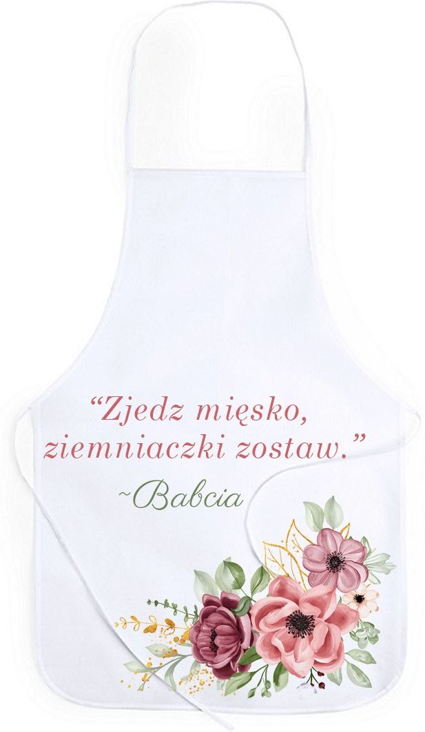 Eko fartuch na dzień babci. Wykonany z tkaniny non-woven (polipropylen). Fartuch posiada sznurki do wiązania. Wymiary: 50 x 73 cm.
