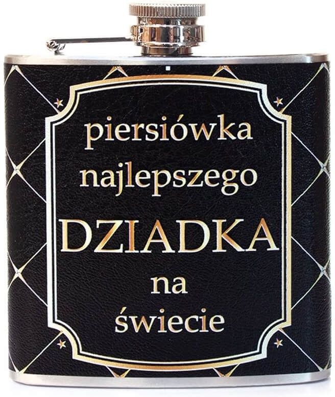 Piersiówka ze stali nierdzewnej z metalowym korkiem w ozdobnym opakowaniu. Na piersiówce widnieje napis "Piersiówka najlepszego Dziadka na świecie". Pojemność: 178 ml. Idealny prezent na Dzień Dziadka.